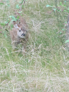 A young fawn seems particularly drawn to our backyard this year because I have yet to mow it. Therefore, the back plot is slowly turning into a meadow with its own kind of character and surprises. But it must be mowed before my open house August 6th., so enjoy it while you can, Bambi.